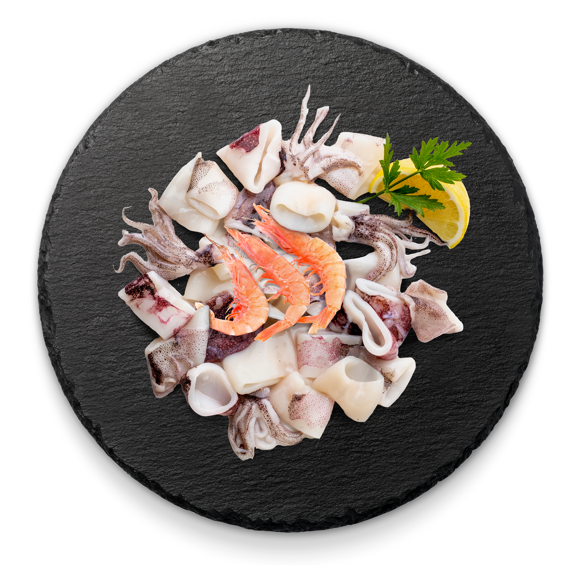 Indischer Kalmar (Loligo duvaucelii), tropische Garnelen (Penaeus spp.),